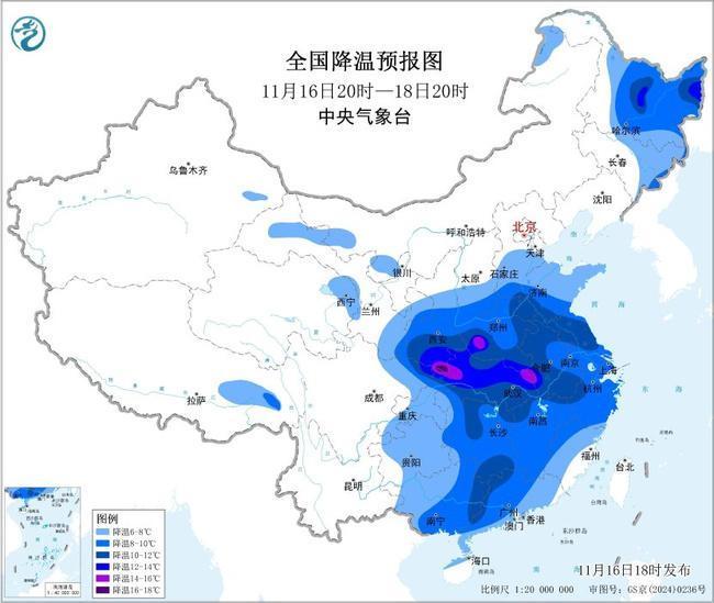 其中,11月16日20时至18日20时,西北地区东部、东北地区北部和东部、华北中南部以及黄淮以南大部地区气温下降6~10℃,陕西南部、四川东北部、重庆北部、湖北、河南东部和南部、安徽大部、江苏中部、湖南北部以及黑龙江东北部等地的部分地区降温10~14℃,陕西东南部、重庆北部、湖北西北部等地局地降温可超过14℃。